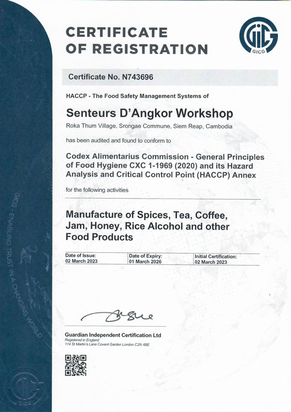 Senteurs d’Angkor has a certificate of registration No.743696 accredited by HACCP (Hazard Analysis and Critical Control Point). HACCP is an internationally recognized standard that defines the requirements for the effective control of food safety. It should be applied during the manufacture of food, ingredients and beverages and is a key element of the CODEX General Principles of Food Hygiene.