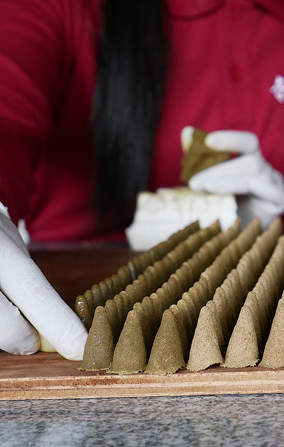 For millennia, on all continents, men had discovered that the smoke of certain woods and plants could bring serenity, inner calm, which is the foundation of well-being. Nowadays, you’ll still find incense in every single pagoda in Cambodia. In our workshop, Incense cones are made of kapok tree sawdust and leaves paste, mixed with water and perfume.