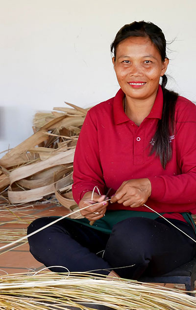 The sugar palm tree is one of Cambodia’s national icons; it plays a very important role in providing material for many home uses as the leaves are used as thatch for roof and walls, mats, baskets … At Senteurs d’Angkor, we use theses leaves to create boxes as a packaging for our products. Our artisans come from Kravann village where we provide sustainable work to 80 other women.