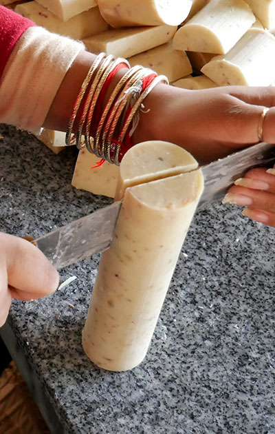 Our natural soaps, based on coconut oil, which is in abundance here, are handmade. Soaps in different shape are available in … different scents. They are also colored with natural ingredients such as charcoal, chia seeds, lotus stamen, curcuma, red clay and lemongrass powder.